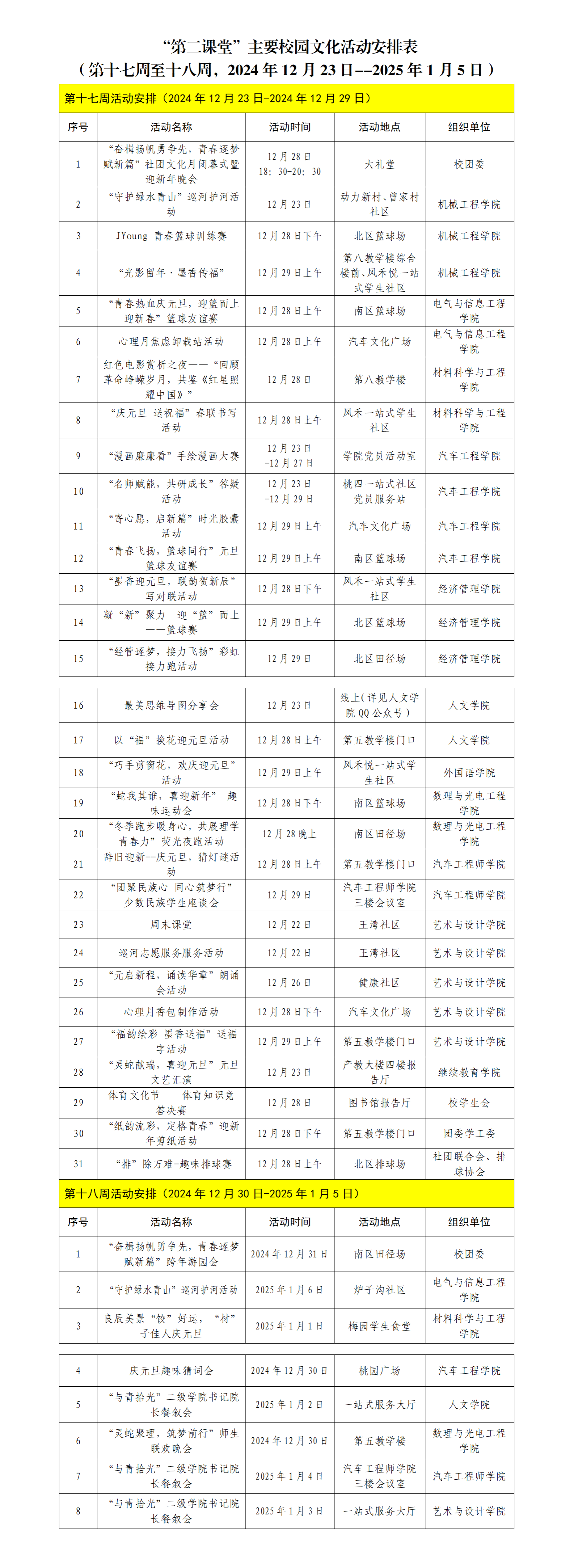“第二课堂”主要校园文化活动安排表 (第十七周至十八周)