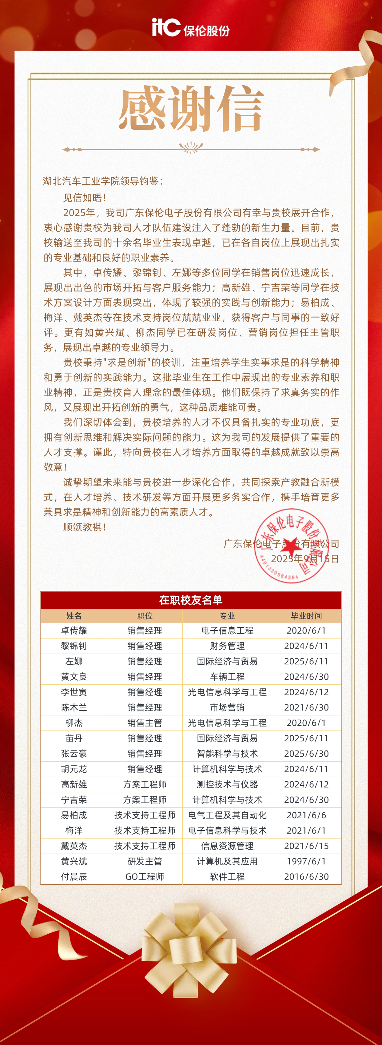 本网讯(文/陈君妍)9月15日,保伦电子股份有限公司向我校发来感谢信,信中盛赞我校测控技术与仪器专业高新雄、计算机科学与技术专业宁吉荣、电子信息工程专业卓传耀等17名毕业生在技术方案设计、技术支持、营销等岗位上展现出扎实的专业基础和良好的职业素养,部分毕业生已经担任主管职务,展现出卓越的专业领导力。